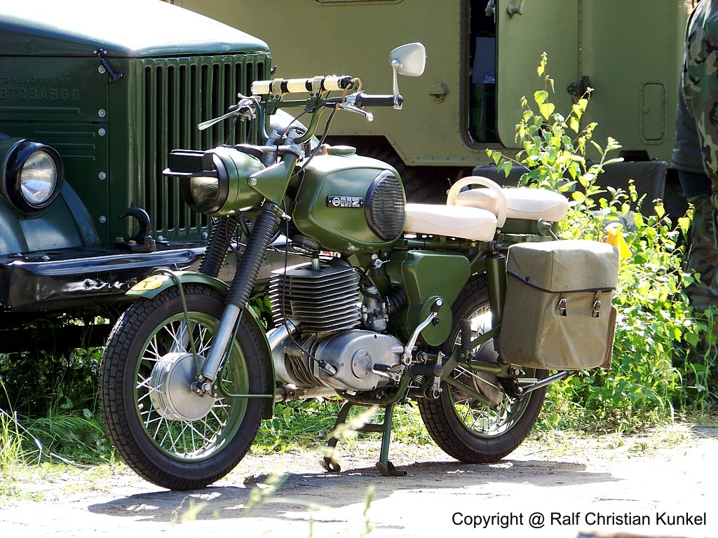 MZ ETZ 250 A - Armeekrad der NVA, flecktarn (in der Form selbst gefertigt) - fotografiert am 23.05.2009 beim Militärfahrzeug-Treffen, St. Barbara Halle, Altes Lager/Jüterbog im Land Brandenburg - Copyright @ Ralf Christian Kunkel