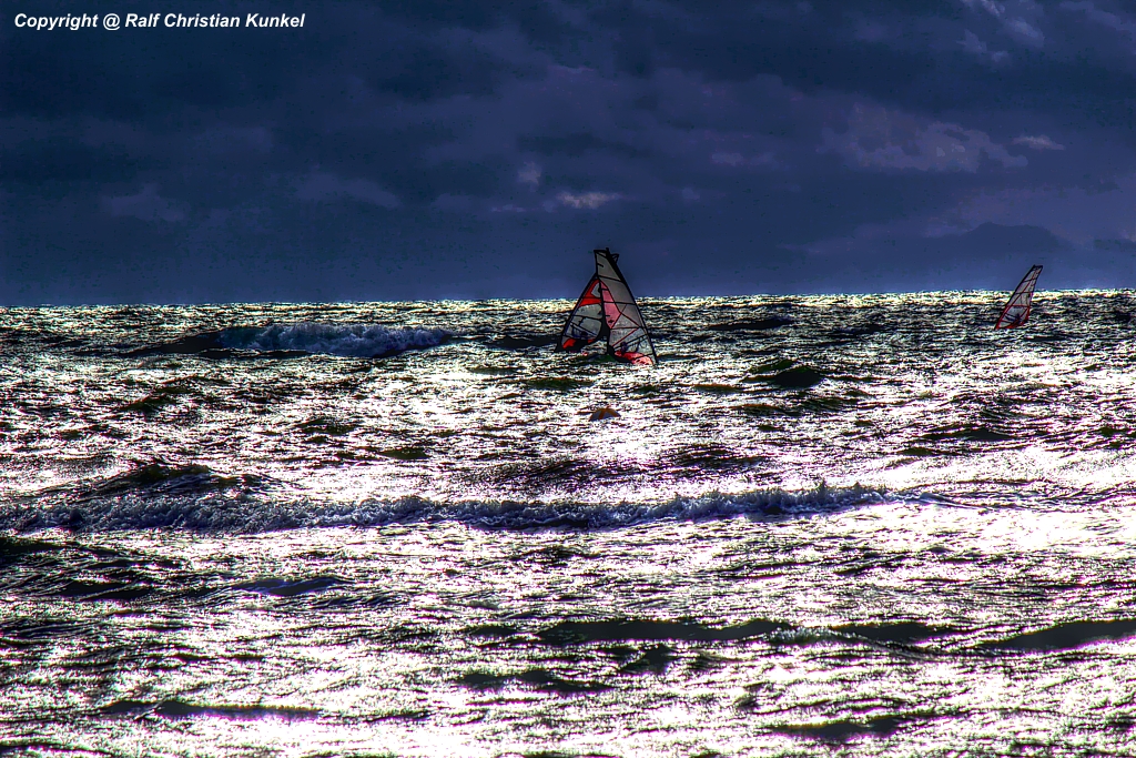 HDR-Bild von der Ostsee - bei diesem Wetter und trotz der Ankündigung eines Regenschauers fühlten sich die Surfer auf ihren Boarden wohl - Freizeitsport, Windsurfen, Ostsee - das Originalfoto entstand am 25.06.2012 in Warnemünde - Copyright @ Ralf Christian Kunkel (zum Bild)